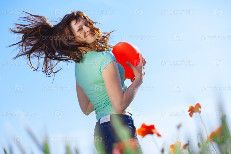 Молодая красивая женщина с красным воздушным шаром в поле