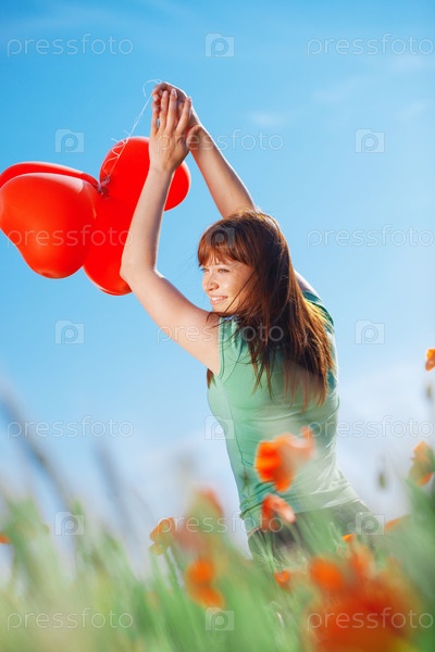 Молодая красивая женщина с красными воздушными шарами в поле