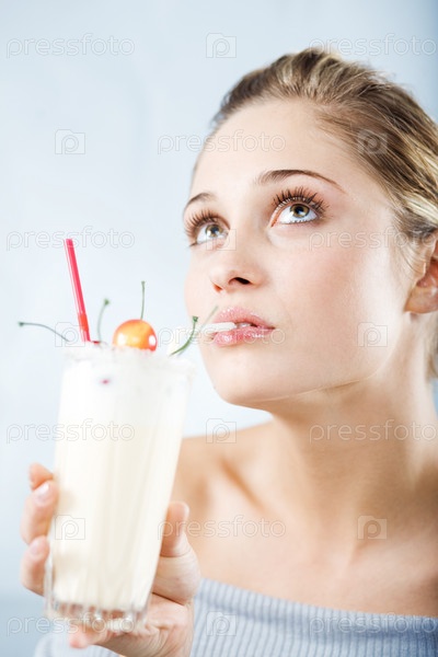 Девушка пьет молочный коктейль