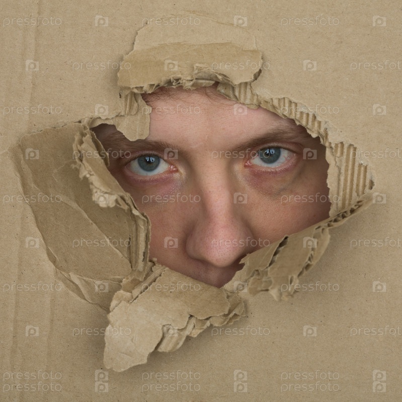 Мужское лицо смотрит вверх из отверстия в картоне