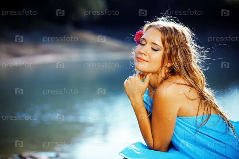 Портрет молодой красивой женщины, позирующей у озера