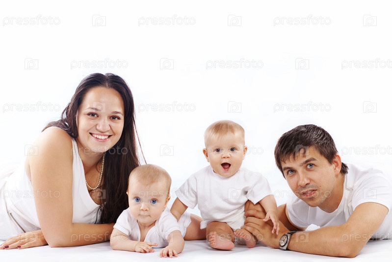 Портрет счастливой молодой семьи с маленькими детьми на белом фоне