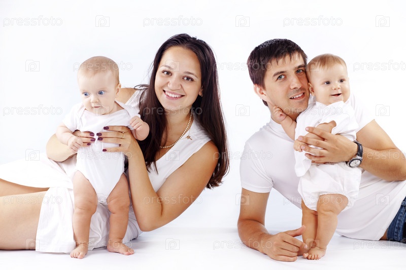 Портрет счастливой молодой семьи с маленькими детьми на белом фоне
