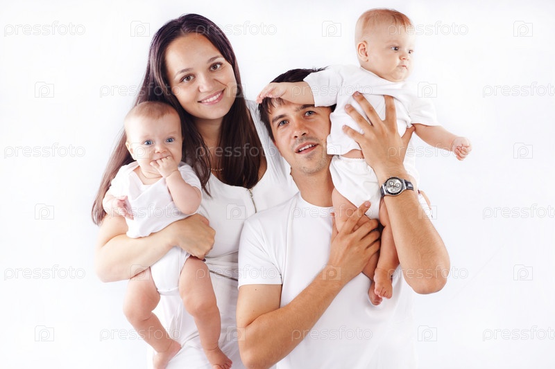 Портрет счастливой молодой семьи с маленькими детьми на белом фоне