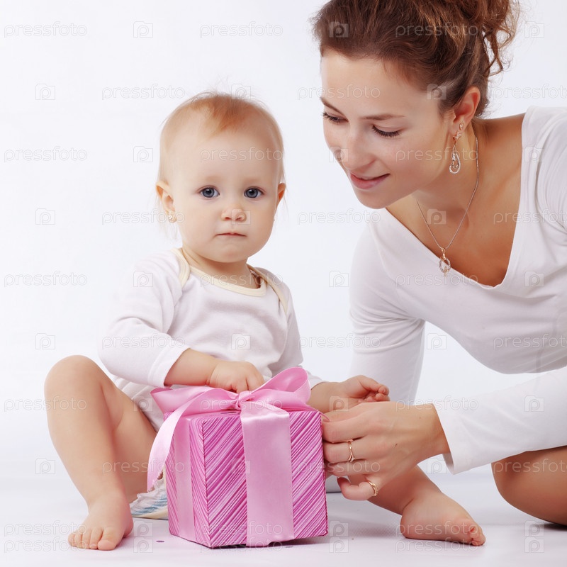 Портрет матери с ребенком, открывающим подарок