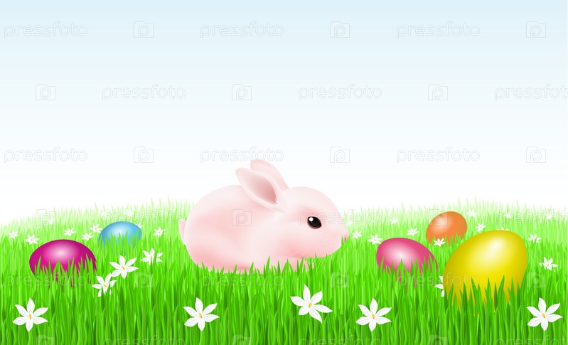 Кролик на траве с пасхальными яйцами. Иллюстрация на белом фоне для дизайна