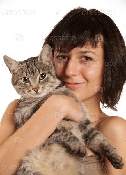 Портрет девушки с серой кошкой в руках, изолированно на белом фоне