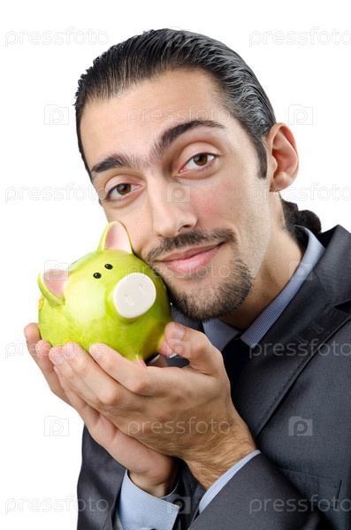 Человек с копилкой на белом фоне