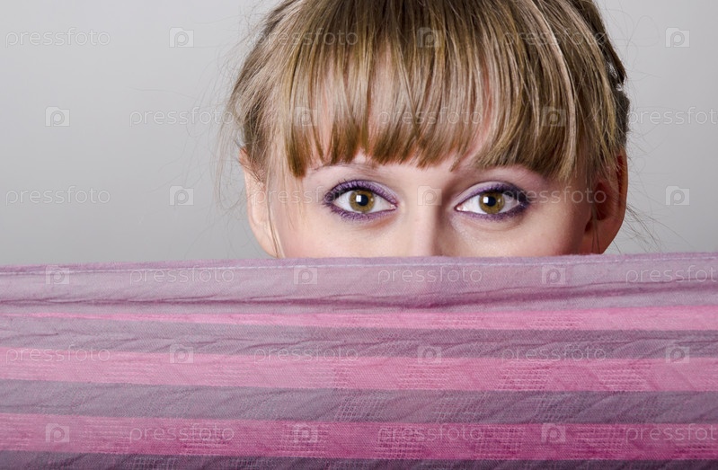 Девушка с карими глазами закрывает часть лица сиреневым шарфом