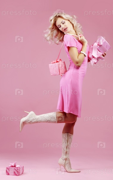 Портрет красивой блондинки с подарками на розовом фоне