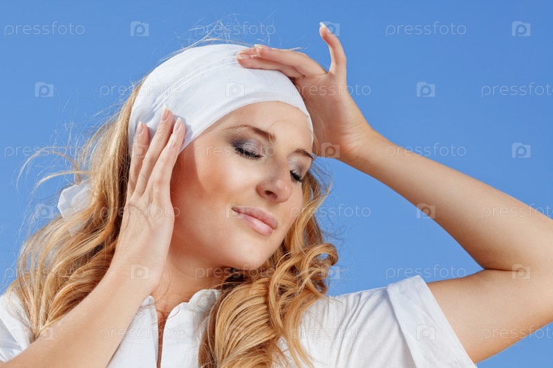 Красивая молодая женщина на фоне голубого неба