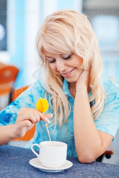 Красивая блондинка пьет кофе