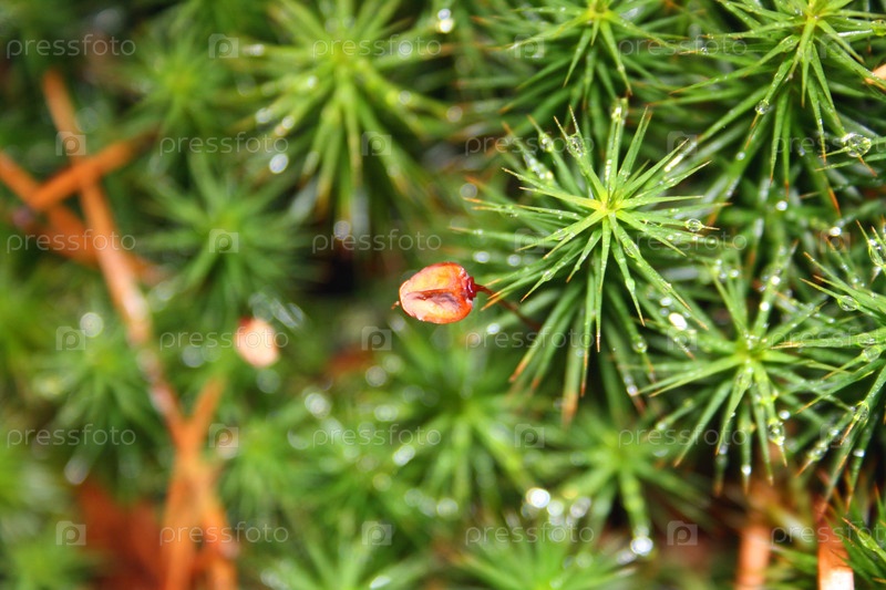 Мох с каплями воды крупным планом с размытостью