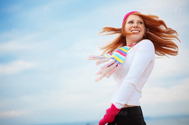 Красивая девушка в шапке и шарфе на морском побережье