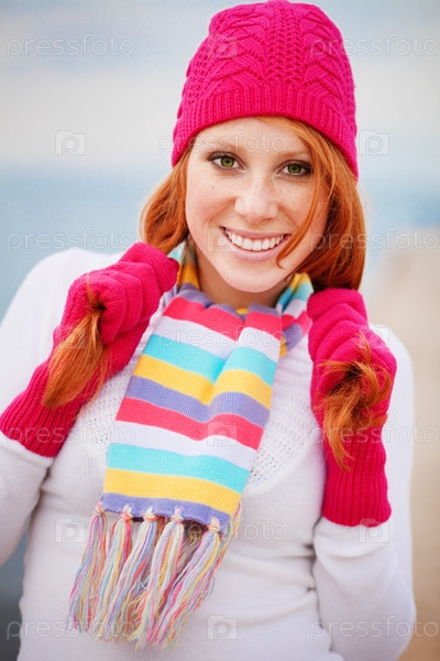 Красивая девушка в шапке и шарфе на морском побережье