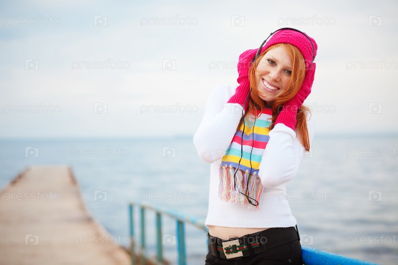 Красивая девушка в шапке и шарфе слушает музыку на морском побережье