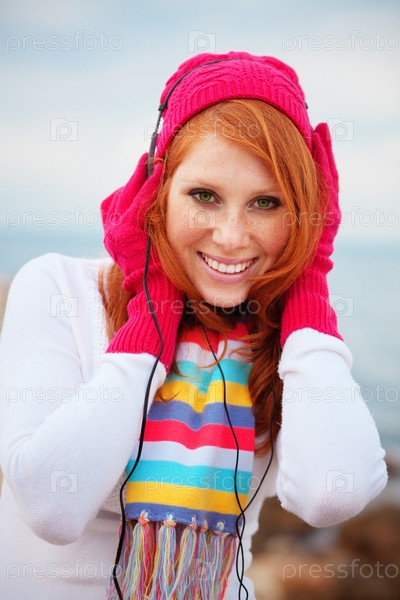 Красивая девушка в шапке и шарфе слушает музыку на морском побережье