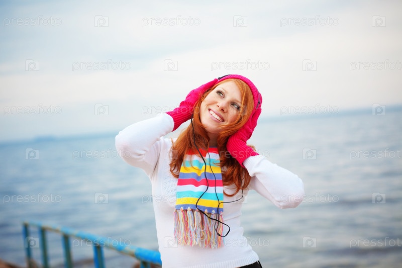 Красивая девушка в шапке и шарфе слушает музыку на морском побережье