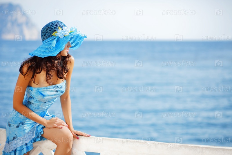 Портрет красивой женщины в летней шляпке,любующейся видом на море