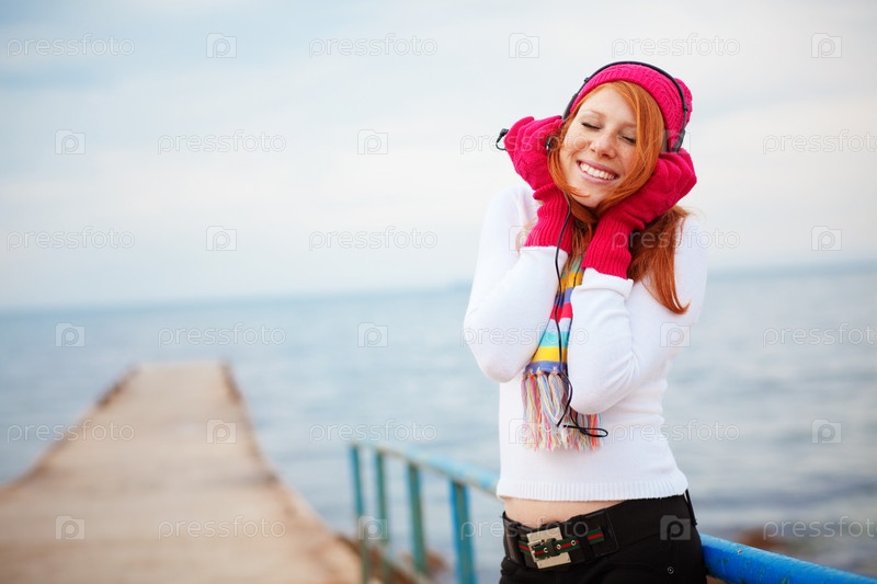 Красивая девушка слушает музыку в шапке и шарфе на морском побережье
