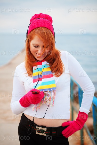 Красивая девушка слушает музыку в шапке и шарфе на морском побережье