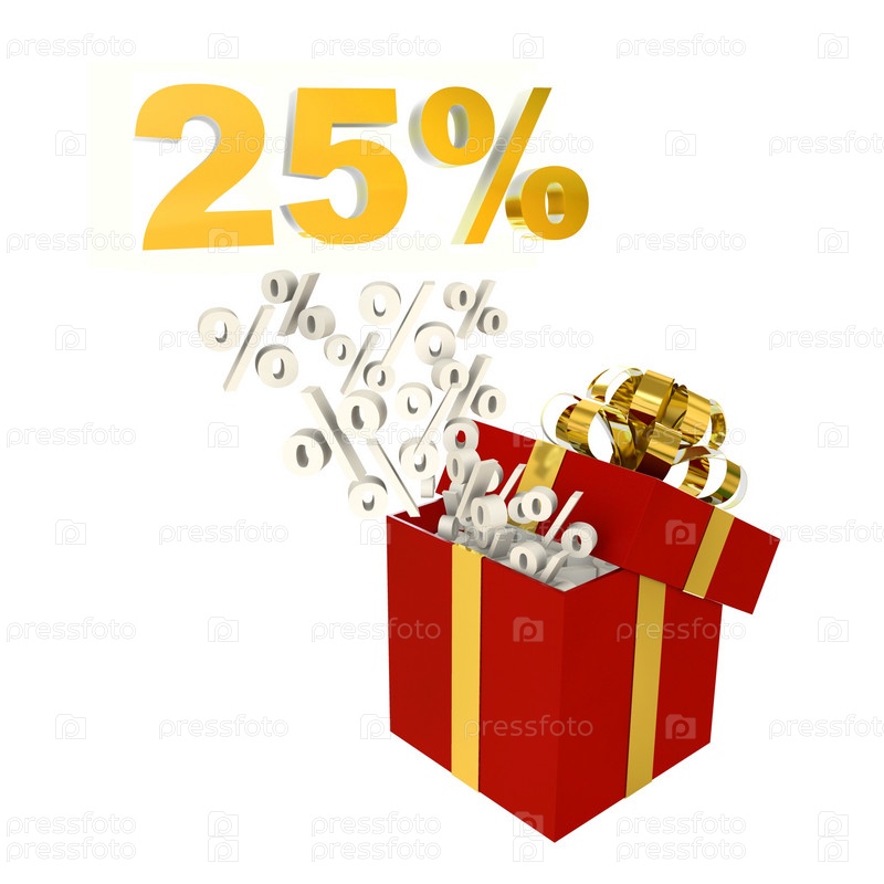 25 процентов в красной подарочной коробке на белом фоне