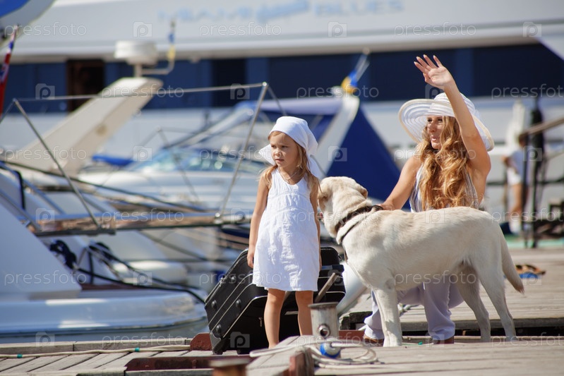 Мать с ребенком, собакой и чемоданом на причале