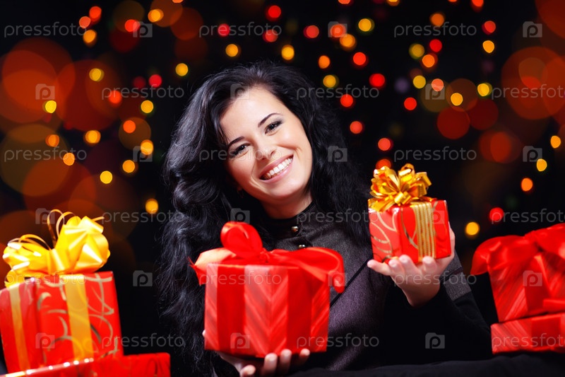 Симпатичная девушка с кучей подарков на темном фоне