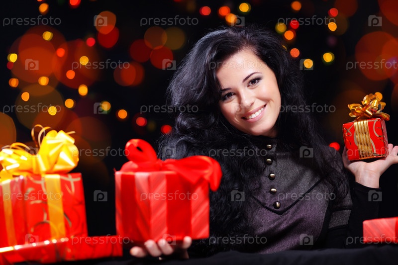 Симпатичная девушка с кучей подарков на темном фоне
