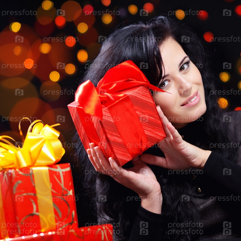 Симпатичная девушка с кучей подарков на темном фоне