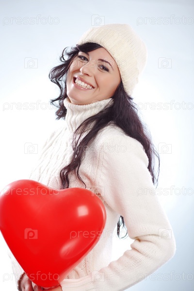 Счастливая девушка в белом свитере и шапке держит в руках красное сердце на белом фоне