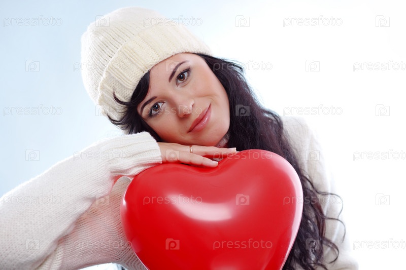 Красивая девушка в белом свитере и шапке держит красное сердце на белом фоне