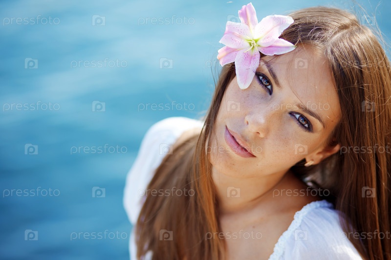 Портрет красивой брюнетки с лилией в ее волосы, позирующей на фоне моря
