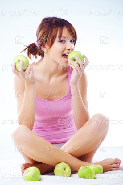 Красивая девушка с зелеными яблоками