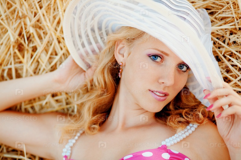 Девушка в летнем платье и шляпке на фоне сена