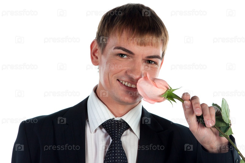 Мужчина держит в руках цветок, на белом фоне