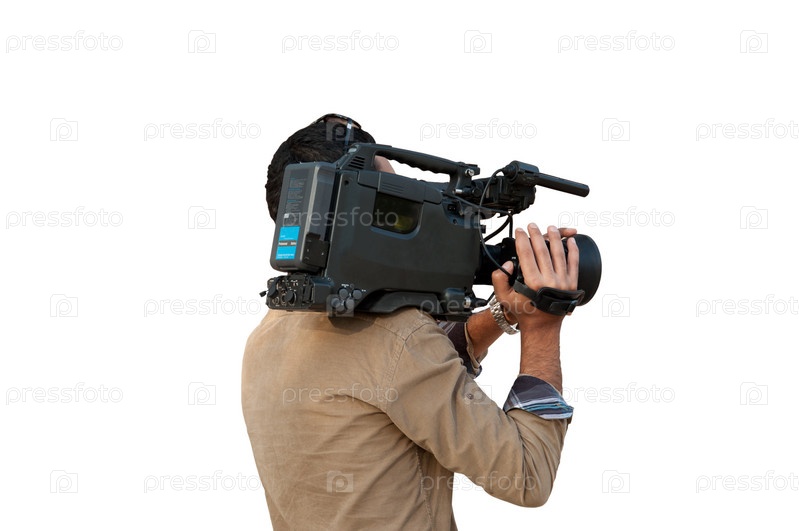 Мужчина с профессиональной видеокамерой в руках, на белом фоне