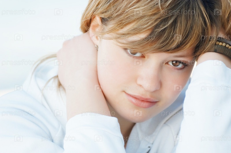 Портрет грустной девушки в белом с руками у лица