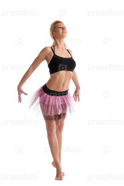 Красивая молодая женщина позирует в современном балетном костюме, изолированная на белом фоне