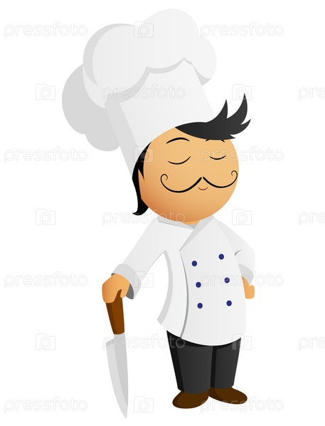 Мультяшный шеф-повар в белом колпаке с ножом на белом фоне