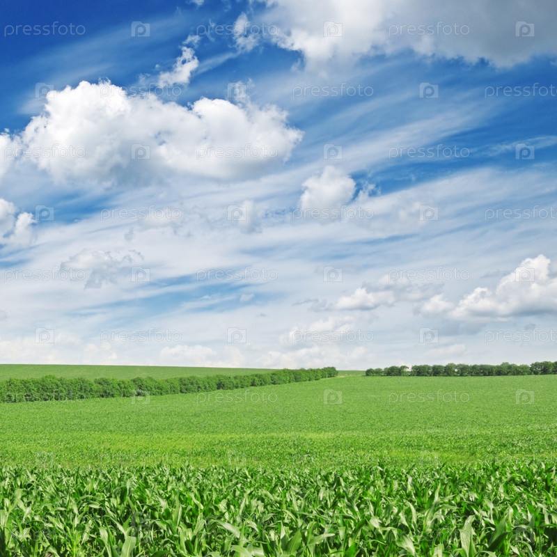 Зеленое поле под облачным голубым небом