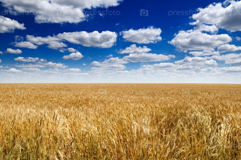 Поле пшеницы под облачным голубым небом