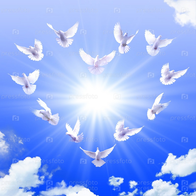 Голуби, собравшиеся в фигуре сердца, на фоне неба и сияющего света