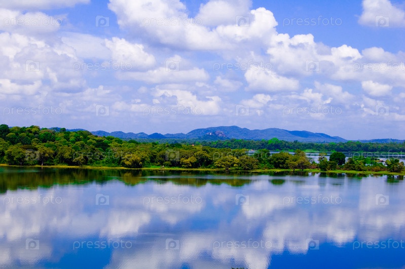 Пейзаж озера на фоне леса и неба