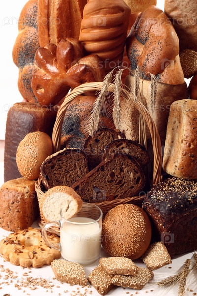 Много разных видов хлеба на белом фоне
