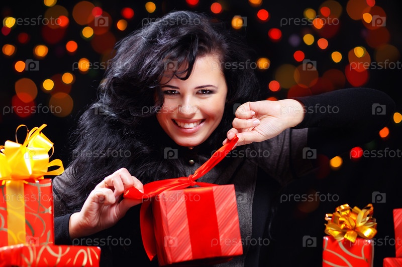 Симпатичная женщина в черном с подарками на фоне ночных огней