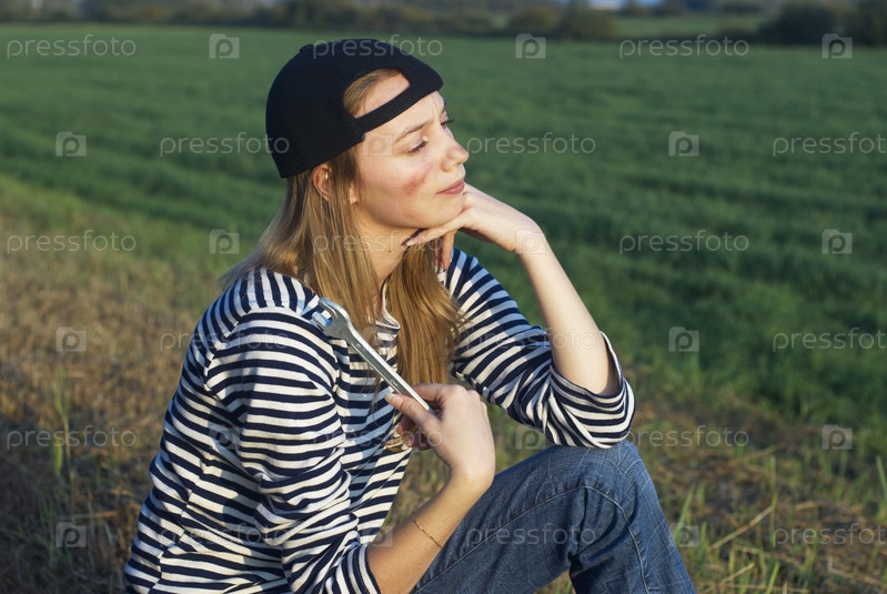 Молодая блондинка с гаечным ключом сидит на траве
