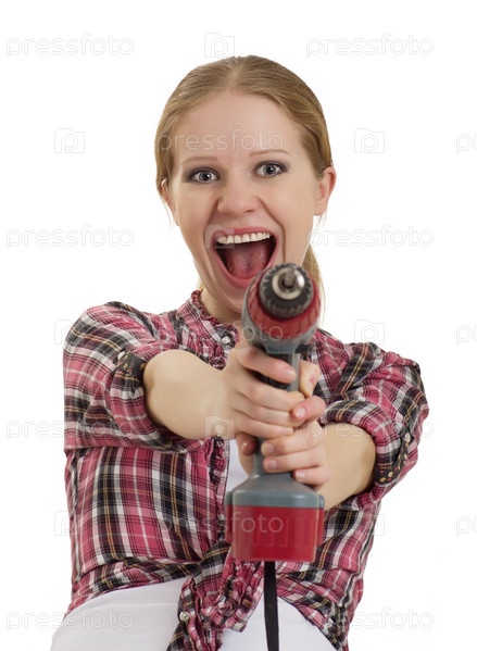 Жизнерадостная девушка с дрелью на белом фоне