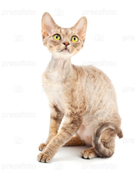 Кошка породы "девон рекс" на белом фоне