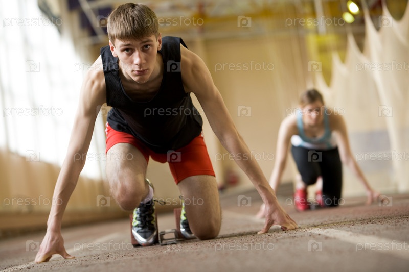 Изображение серьезного молодого человека, готового начать бегать со спортсменкой на заднем плане